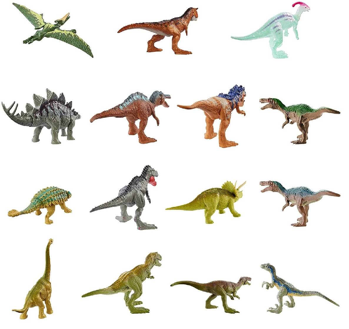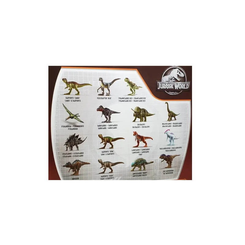 Baryonyx “Limbo” / Velociraptor Blue / Tyrannosaurus Rex / Pteranodonte / Tarbosaurios / Triceratops / Braquiosaurio / Estegosaurio / Baryonyx “Grim” / Carnotaurio / Parasaurolopus / Irritator / Baryonyx “Chaos” / Ankylosaurus  “Bumpy” / Siat Meekerorum