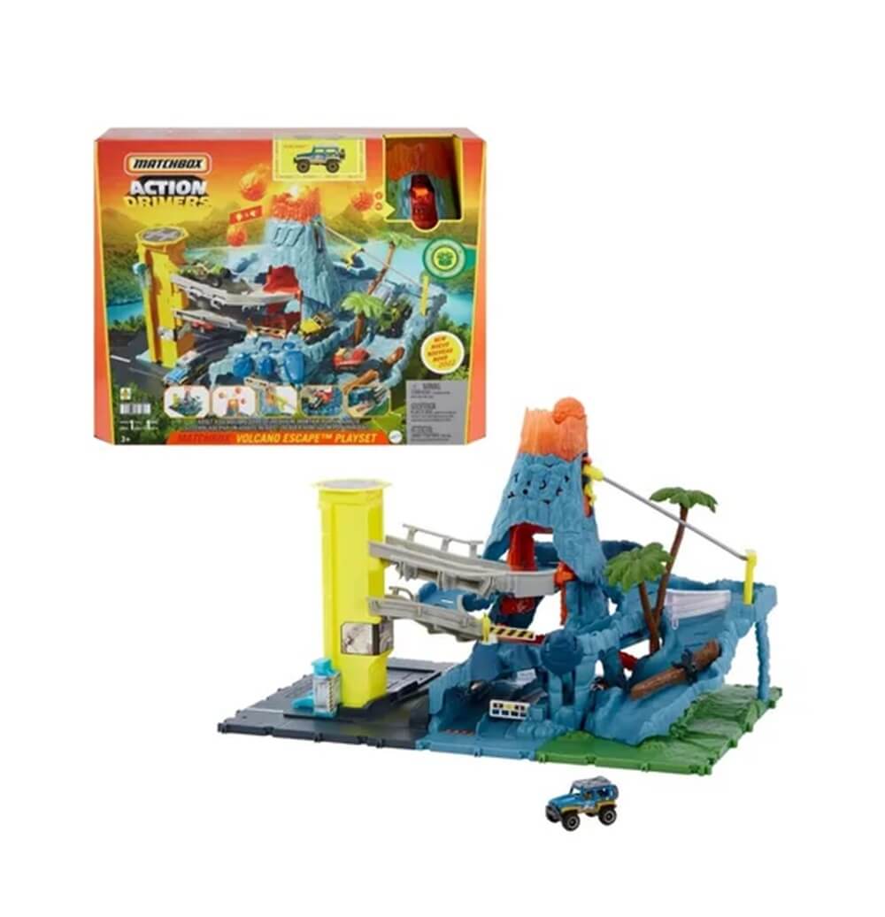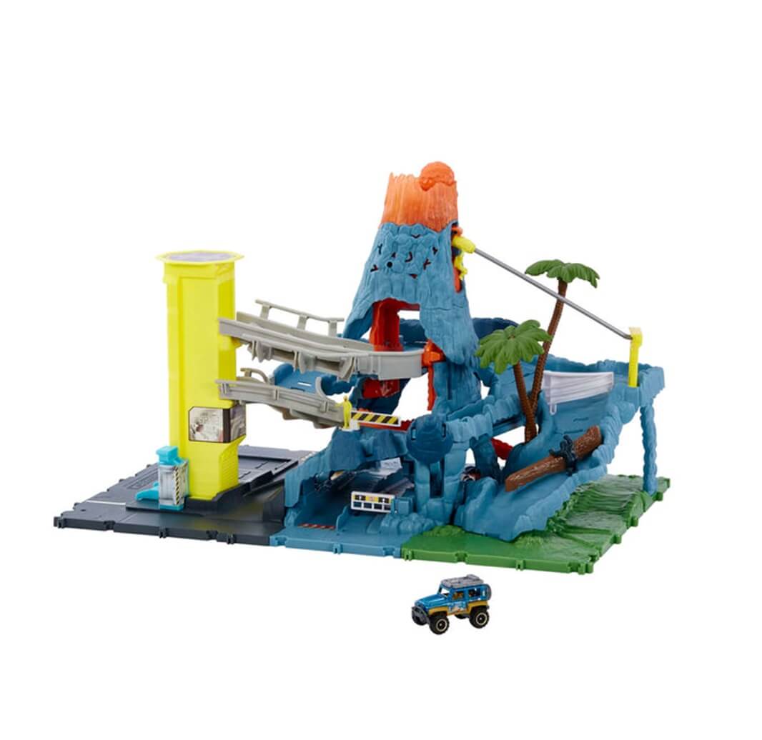 Un elevador que los niños activan lleva los vehículos a la cima del volcán, donde encontrarán una serie de obstáculos a medida que conducen hacia un lugar seguro.
