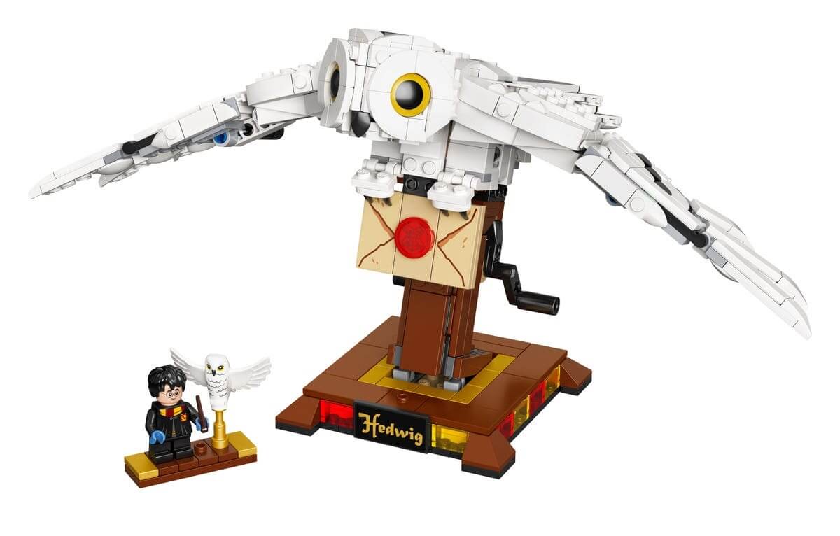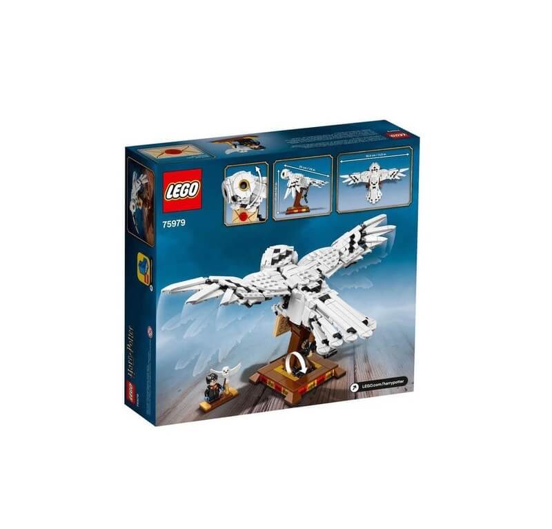Con una envergadura de aproximadamente 34 cm, esta maqueta para construir con ladrillos, compuesta por 630 piezas, muestra a Hedwig en vuelo entregando una carta importante.