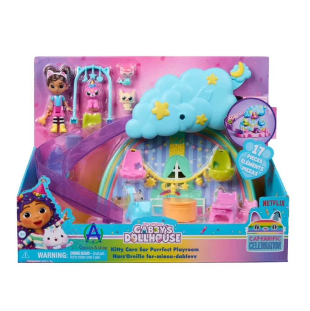 Baja a los gatitos por turnos por el tobogán, diviértete dando paseos con el carrito, usa la trona a la hora de comer y abre la caja sorpresa para descubrir un juguete sorpresa antes de escanear el código QR
