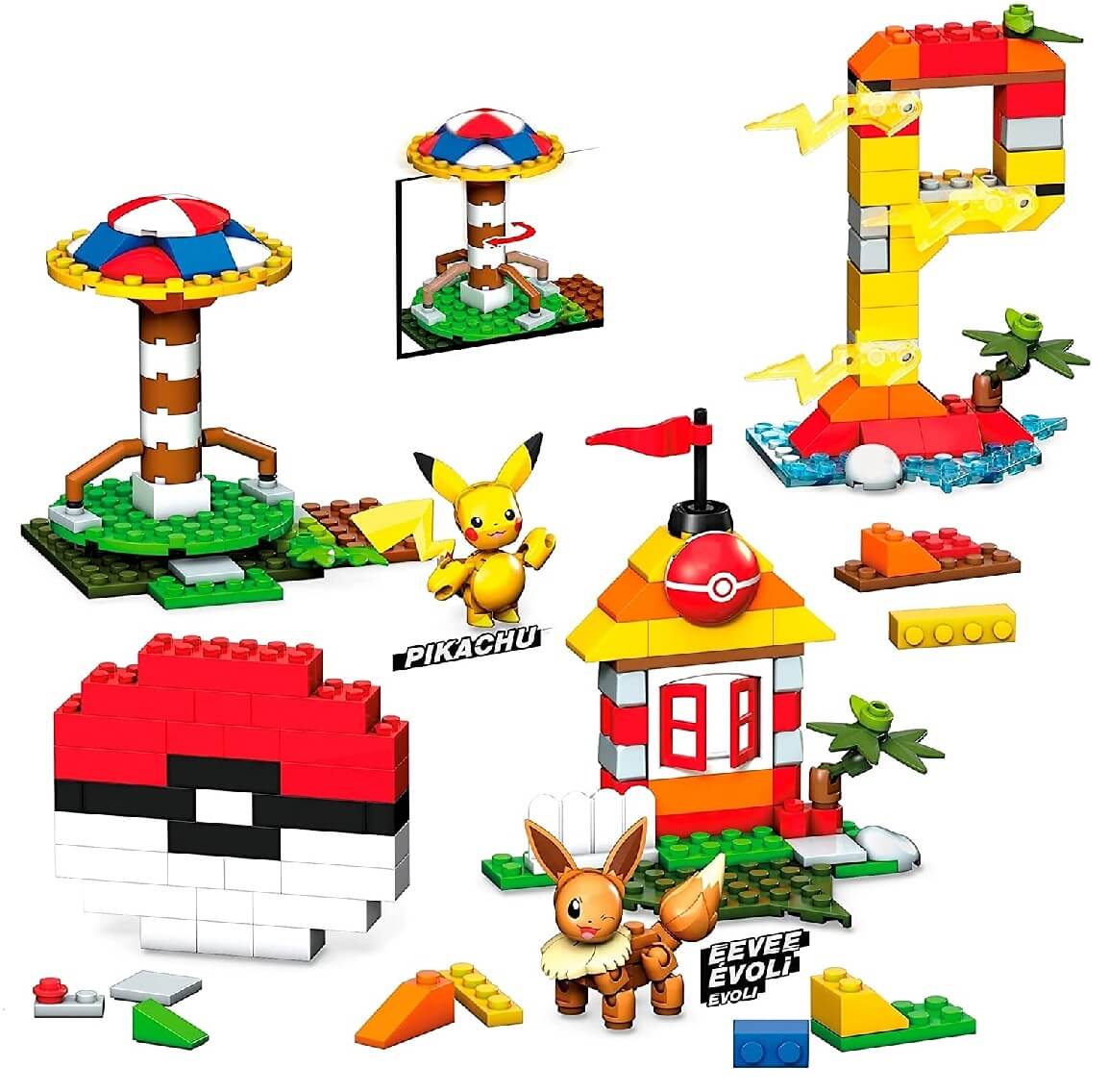 Un mundo Pokémon personalizado te espera con figuras armables de Pikachu y Eevee, piezas especiales (como relámpagos y piezas que giran), formas únicas y una paleta de colores con temática de Pokémon