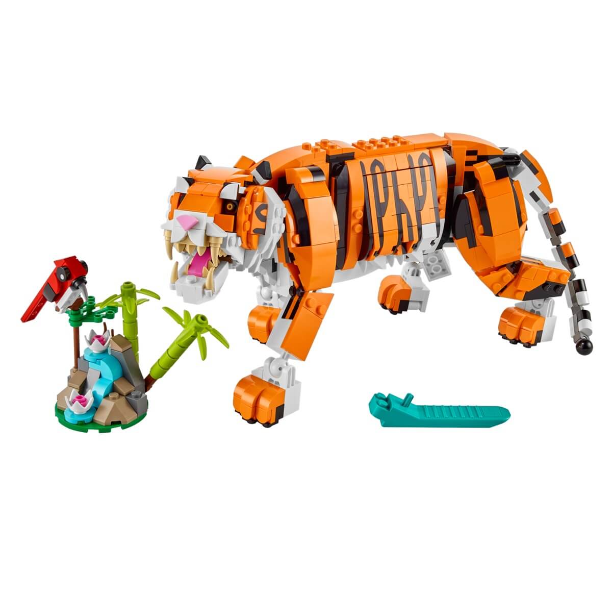 Observa al poderoso tigre, que recorre su territorio y se prepara para abalanzarse sobre su presa. Aún te espera más acción, porque puedes convertir al tigre en un simpático panda rojo que duerme en los árboles y mordisquea bambú, transformarlo en una carpa koi que nada en los lagos o dejar volar tu imaginación y usar los bricks para crear un nuevo animal.