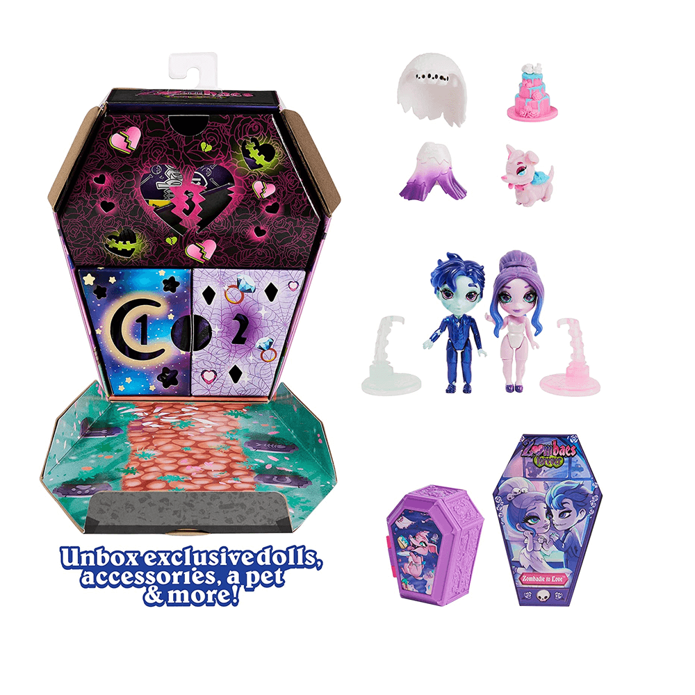 –  2 muñecos Zombaes Forever, 1 accesorio, 2 soportes para muñecas, 1 mascota Zombaes Forever, 1 ataúd para mascotas, 1 tarjeta de intercambio, 1 hoja de coleccionista
